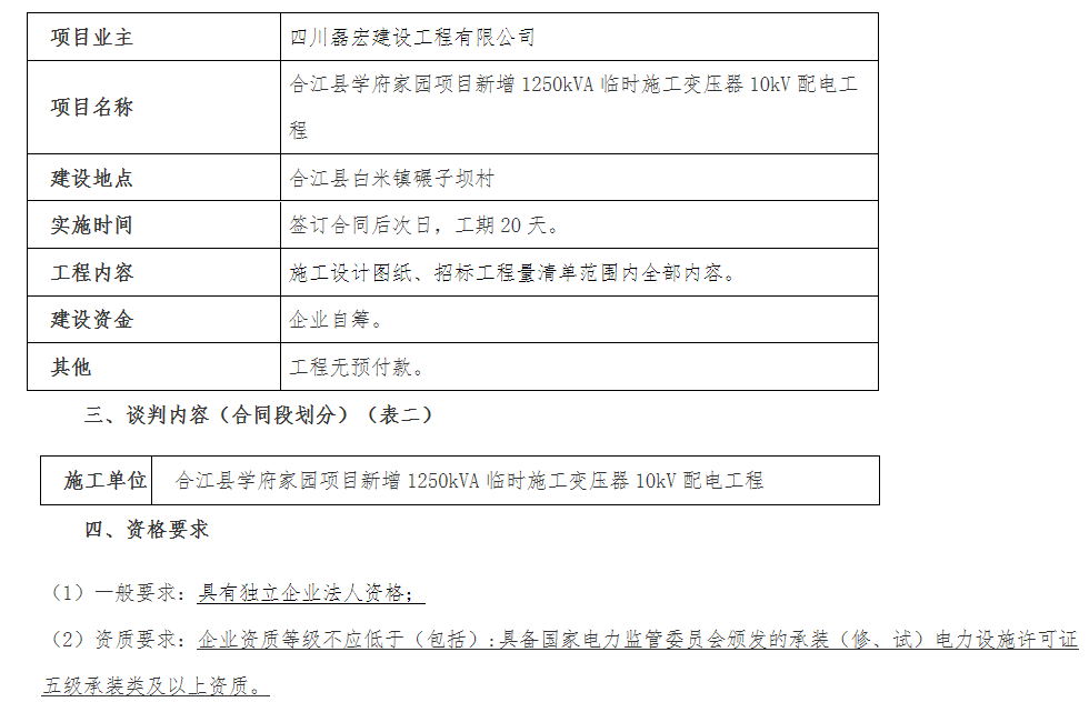 一 、 本 次 談 判 項(xiàng) 目 合 江 縣 學(xué) 府 家 園 項(xiàng) 目 新 增 1250kVA 臨 時(shí) 施 工 變 壓 器 10kV 配 電 工 程 施 工 單 位 , 現(xiàn) 通 過 競 爭 性 談 判方式選擇和確定承包人,誠邀符合資格條件的潛在申請人參與本項(xiàng)目的競爭性談判。