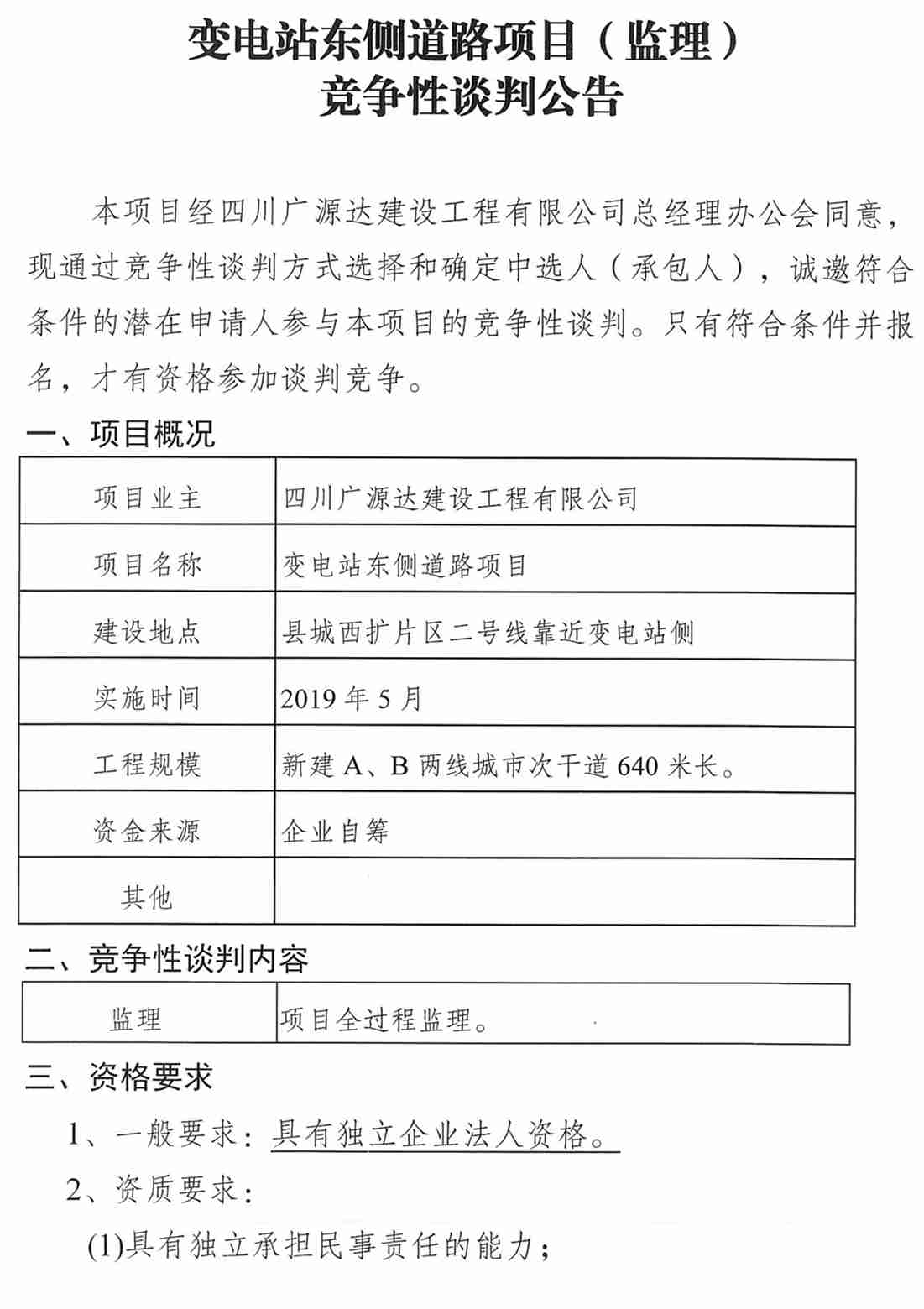 變電站東側(cè)道路項(xiàng)目(監(jiān)理)競(jìng)爭(zhēng)性談判公告