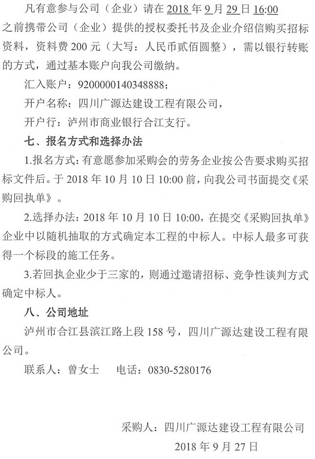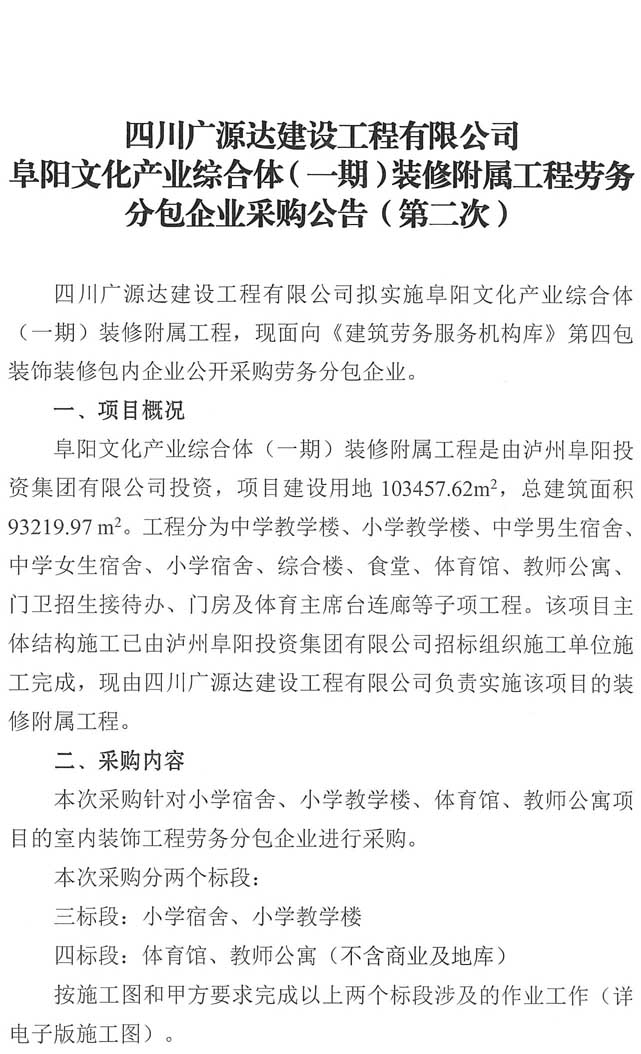 采購公告:四川廣源達建設(shè)工程有限公司阜陽文化產(chǎn)業(yè)綜合體(一期)裝修附屬工程勞務(wù)分包企業(yè)采購公告(第二次)