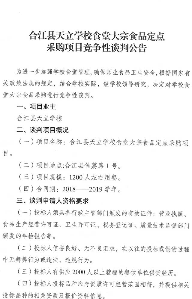 競爭性談判公告:合江縣天立學校食堂大宗食品定點采購項目競爭性談判公告
