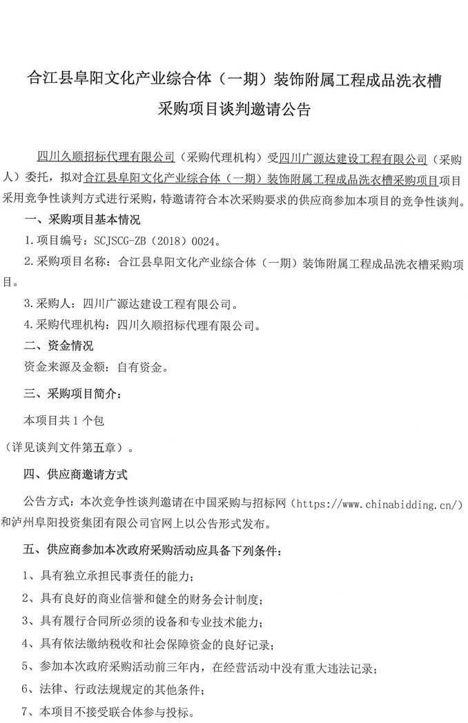 合江縣阜陽(yáng)文化產(chǎn)業(yè)綜合體(一期)裝飾附屬工程成品洗衣槽 采購(gòu)項(xiàng)目談判邀請(qǐng)公告.doc