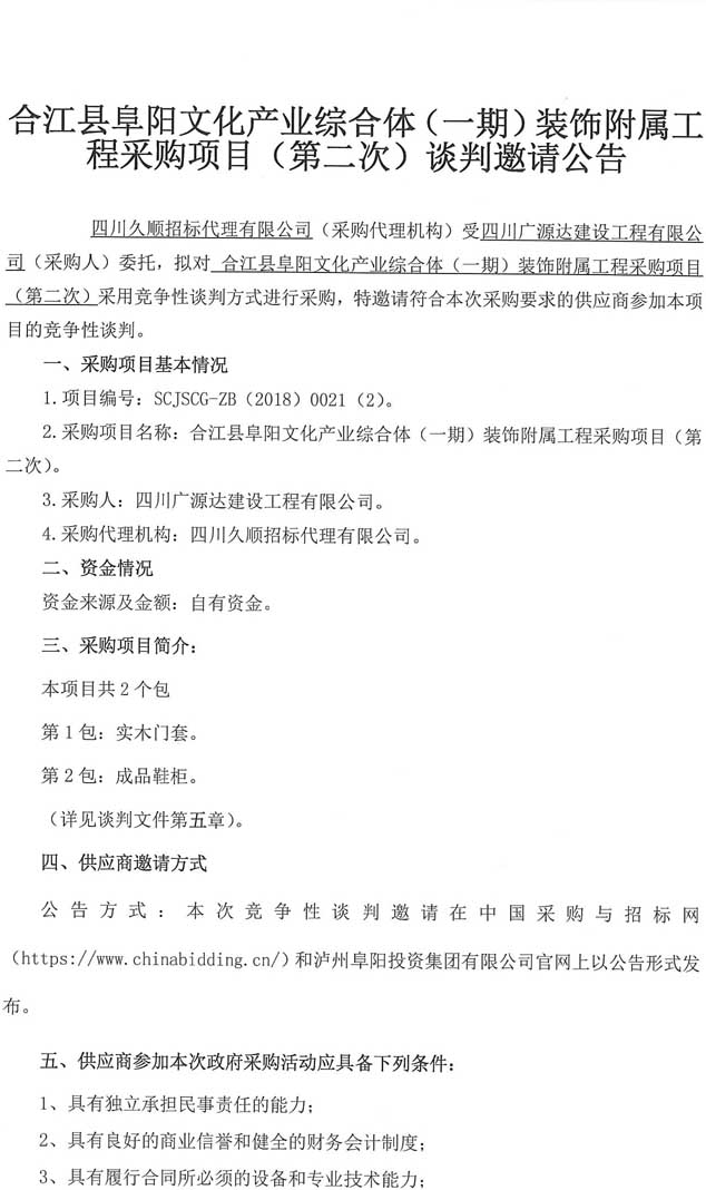 合江縣阜陽文化產(chǎn)業(yè)綜合體(一期)裝飾附屬工程采購項(xiàng)目(第二次)談判邀請(qǐng)公告.docx