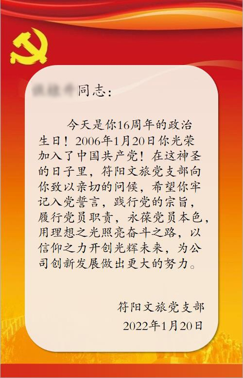 支部在核準每一名黨員入黨時間的基礎上,按照黨員入黨日期建立黨員“政治生日”臺賬,每逢黨員“政治生日”當天,黨支部將在黨員微信群發(fā)一張電子賀卡,讓黨員充分感受到組織的關(guān)懷與溫暖,從而將思想認同轉(zhuǎn)化為牢記初心、堅定信仰的前進動力,努力為公司的創(chuàng)新發(fā)展做出更大貢獻!
