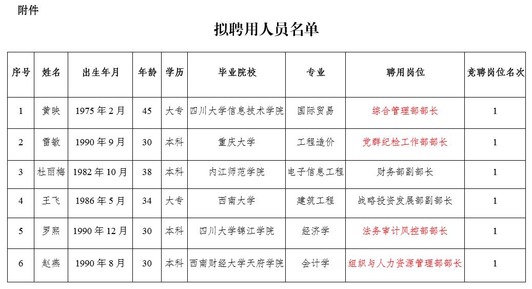 根據《瀘州阜陽投資集團有限公司關于2020年本部中層管理崗位內部競聘的公告》(瀘阜投〔2020〕20號)規(guī)定,經阜陽集團黨委研究決定,擬聘用黃映等6人為瀘州阜陽投資集團有限公司本部中層管理人員?,F面向社會公示7個工作日,公示時間2020年6月2日至2020年6月10日。公示期間,如有問題,請及時向瀘州阜陽投資集團有限公司組織與人力資源管理部反映。要求舉報者署實名,實事求是地反映問題,并提供必要的調查線索。